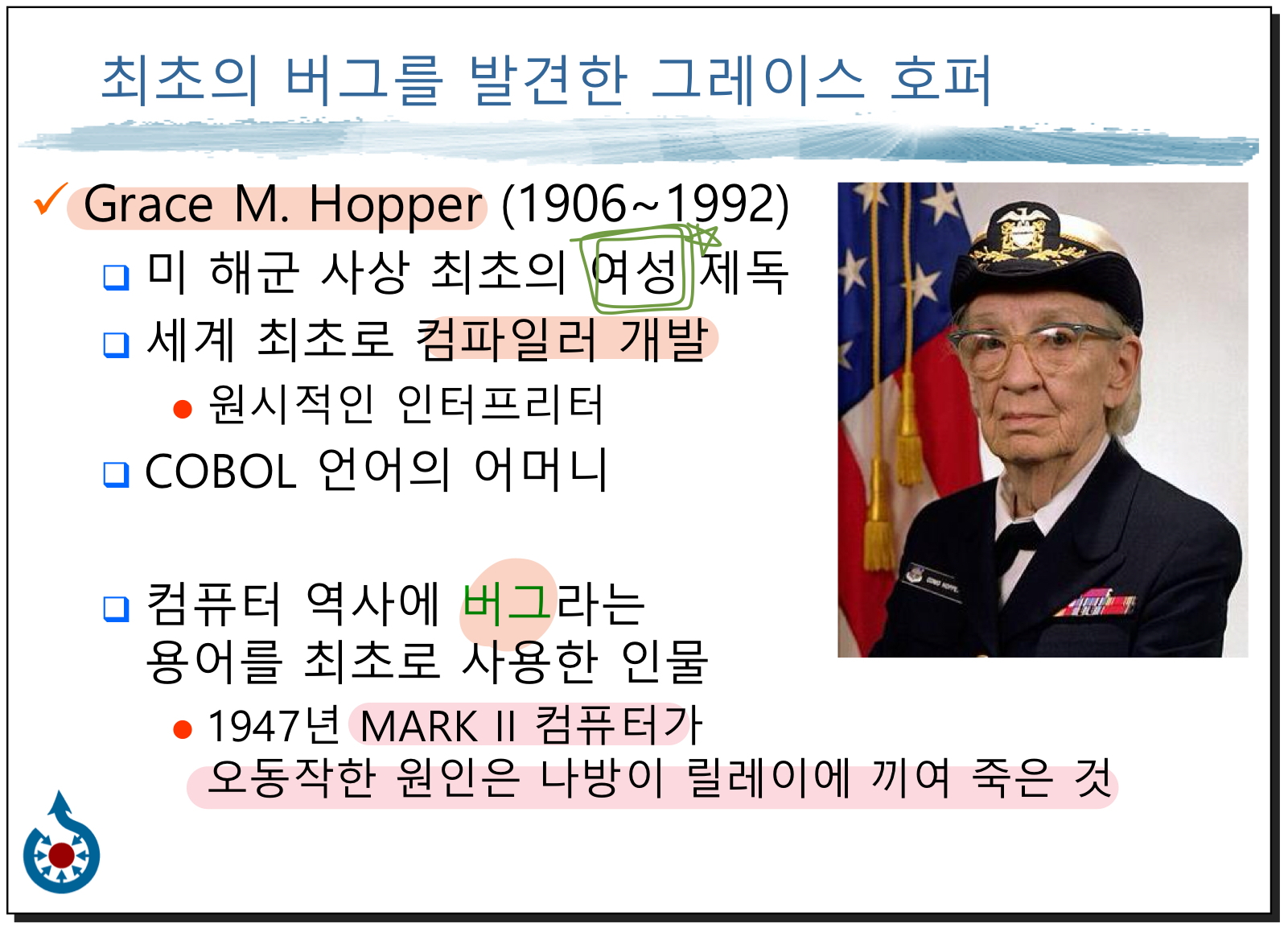 1947 - 그레이스 호퍼 (미국 여자 해군) - 컴파일러 개발 - 버그(MARK2 나방 릴레이 끼임 사고)